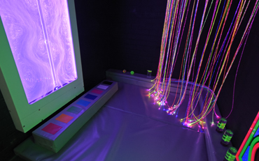 One corner of the room has a fibre optic curtain in a quarter circle shape that allows users to sit behind the fibres and enjoy the sensory effect. The fibres are safe to touch, there is no electricity present in the curtain strands. The curtain has a mirror canopy that supports the fibre optic effect. As users look up, they see the colourful fibres reflected, appearing twice as long as they actually are. As the fibres are UV reactive, they will glow brightly when the UV flood light is active.