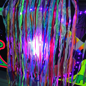 The dark room has the option for colourful images to be projected onto the walls and ceiling and for the use of UV flood lighting. This light allows fluorescent items in the room to glow in the dark.